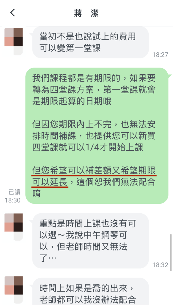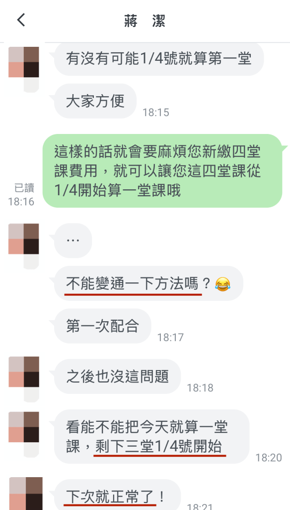 從最後一張截圖可看出,這位家長企圖想把重點導成我們沒辦法提供上課時間,但事實上是,我們已經費了一番功夫,才跟兩位老師協調出可以安排這位家長跟小孩同時上課的時段,但已經訂好的時間,對方卻又說後面兩個禮拜無法上課。而補課這件事是請老師們在約定好的時間之外,額外安排時間給學生,約得成是剛好,喬不攏是正常。