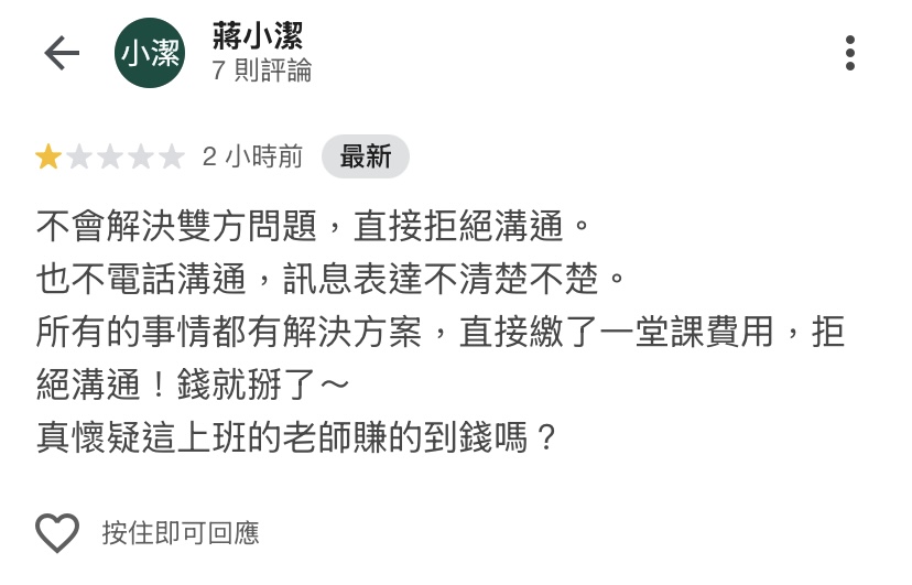 ⬆️我們認為,約好的上課時間,但自己後面兩週有事,似乎並不是我們的責任,並且由於僅僅只是在試上階段,這位家長就可以因不想配合規定,衍生出這麼多爭論的對話,我們覺得往後在其他方面,肯定也會有非常多類似的狀況,因此在經過討論後,我們微婉地請這位家長另外尋找適合他的教室。